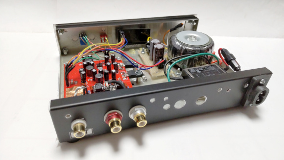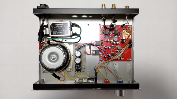 | いやあ、電源部を内蔵するだけで、格式が一気に上がったように感じます。まあ、気のせいかもしれませんが、音も良くなったように感じます。トランスが結構重たいので、ずっしり感が増してとても良いですね。ちょっとだけ電源部を説明します。 | |