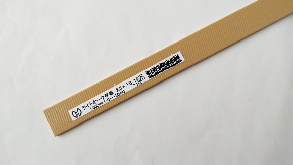 | ホームセンターで「ライトオーク平板」を購入しました。長さは1mあります。18mm幅で厚みが2.5mmですね。上の写真の裏面側に長手方向に筋が入っており、かなり曲げやすい板材です。まあ良く似た他のものもあるかもしれません。 | |