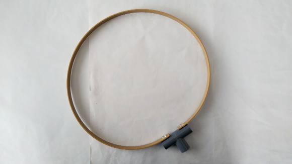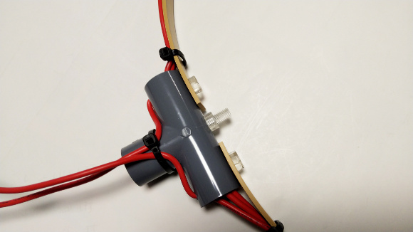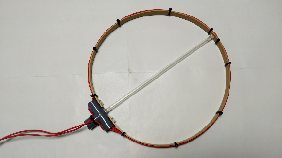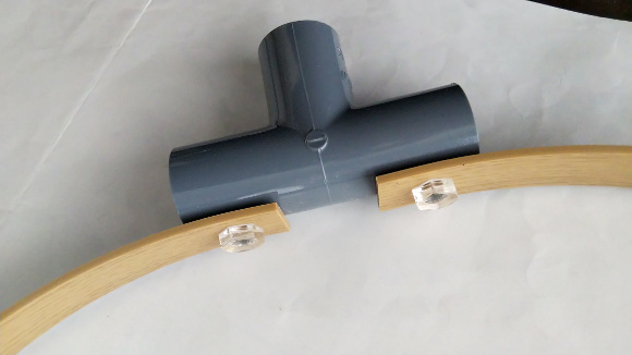 | ライトオーク平板とT13の両端にφ6mmの穴を開けて、ポリカねじで上の写真のように固定します。ポリカねじのナットはT13パイプの中で締め付けます。これで直径約30cmのループになります。 | |