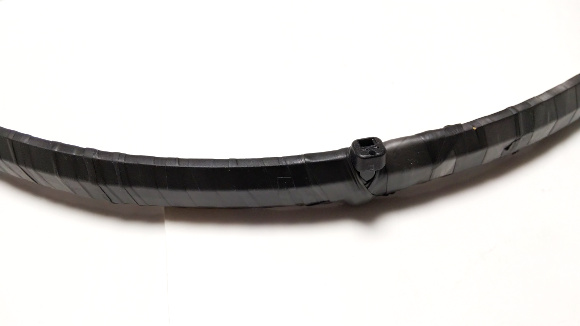 | 屋外で使用するので、耐候と防水を考慮してブチルゴムテープでぐるぐる巻きにします。ブチルゴムテープは結構伸ばして巻くので時間が経つとところどころに綻びが出てきますので、時間をおいて何度も何度も巻いておきましょう。一旦、ループアンテナの部分は完成です。 | |