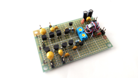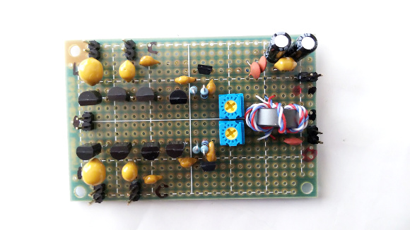 | 続いてアンテナチューナー基板を作ります。写真では可変容量ダイオードを4個づつ配置していますが、最終は3個づつとしました。中波専用にしてあります。またアンテナ出力の取り出しはΔLOOP7のように電源ラインに乗せるのではなく、別取り出しとしています。この辺りは過去の記事を参照下さい。 | |