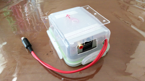 | ループアンテナ部分とはRCAジャックで接続します。今回は取り外ししやすいようにしています。またタッパそのものをループアンテナの支柱に取り付けるために、ポリエチレンも接着出来る接着剤で2mm厚のペット樹脂板を貼り付けておきます。 | |