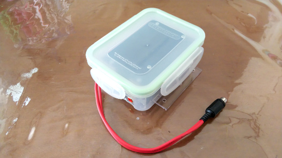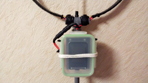 | 接続部から水が入らないようにブチルゴムテープでぐるぐる巻きにしておきましょう。万が一タッパの蓋が開かないように耐候性のあるロープで縛っておきます。 | |