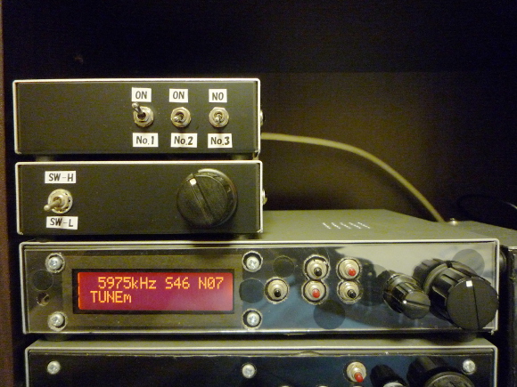 | 上の写真を見ていただくと判ると思いますが、この時はDSP短波ラジオ+アンテナチューナー+ΔLOPP7アンテナを組み合わせていました。しかしながら最近このアンテナチューナーが周波数に応じた正しい制御をしてしていないことに気が付きました。最近はΔLOOP7アンテナをSDRドングルに接続することも多くなり、ΔLOOP7の制御を完全自動化から手動制御にするほうが色々と都合が良いことも判りました。そこで今回はこれらのシステムの見直しを行い、秋の夜長に短波受信を楽しむことにします。 | |