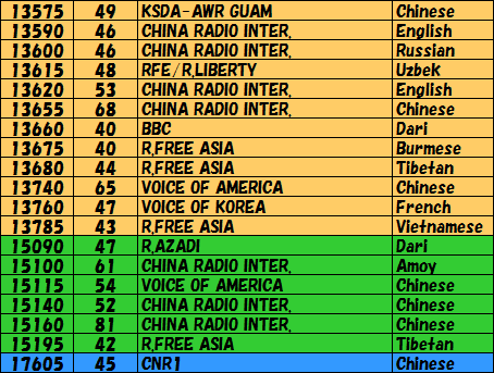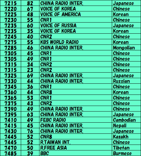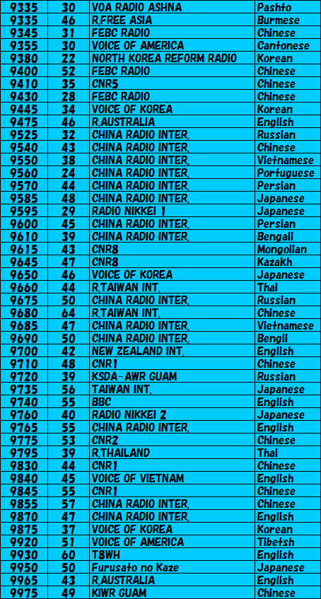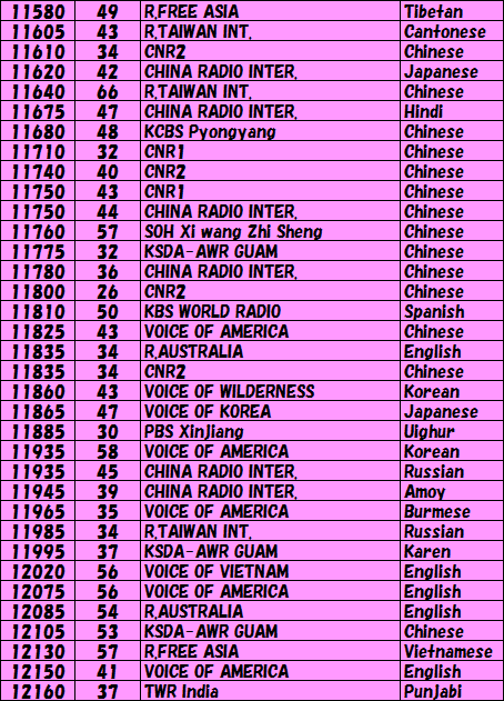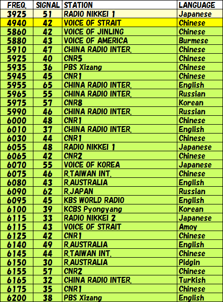 | それでは3日間で受信出来た周波数と放送局を記します。短波放送は時間によってどんどん変わりますのでいつも必ず受信出来るとは限りません。各自で充分確認下さい。SIGNALの欄に記載してある数値はDSP短波ラジオが表示したものです。短波はご存知のように「フェージング現象」を伴いますので、実際の数値はこれよりかなりの範囲で変化していることをご理解下さい。まあ他の局との信号の強さを比較するために使って下さい。言語のニュアンスでその局を聞いていると、私自信は思っていますが、間違っている部分もあるかもしれませんので、そのへんはご愛嬌ということで・・・ | |