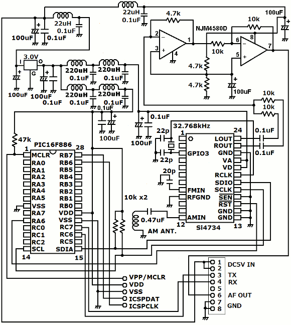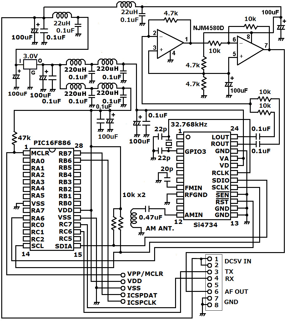 | 受信ユニットにはDSPラジオ部、制御マイコン部、電源部、音声バッファ部があります。DSPラジオ部には定番のシリコンラボ製Si4734を使用します。Si4735も同様に使えます。ただ入手が少し難しい状況かもしれませんので、コンセプトは同じとしてDSPラジオ部を他のDSPチップに変えても良いかも知れません。もちろんDSPチップに合うようにソフトの改造は必要かと思います。私の製作が皆さんの製作のヒントになれば幸いです。ラジオの音声出力はOPアンプのバッファーをかまします。受信ユニットと操作ユニット間はケーブルで5m程度の距離があると思いますので、チューナーのチップに直接ケーブルが接続されないので、ノイズの影響を受けにくくなると思います。受信ユニットと操作ユニットはLANケーブルで接続します。電源部分にはLCフィルターを豊富に使用しています。電源からのノイズを低減しています。電源の供給は操作ユニットから行います。 | |