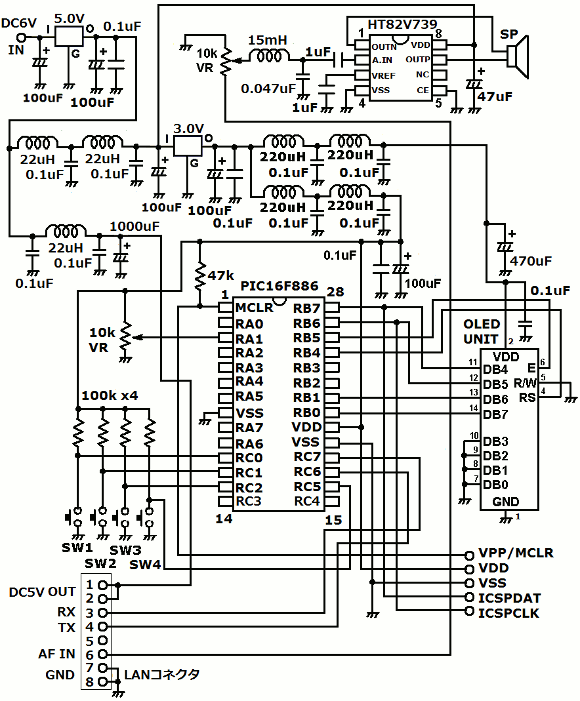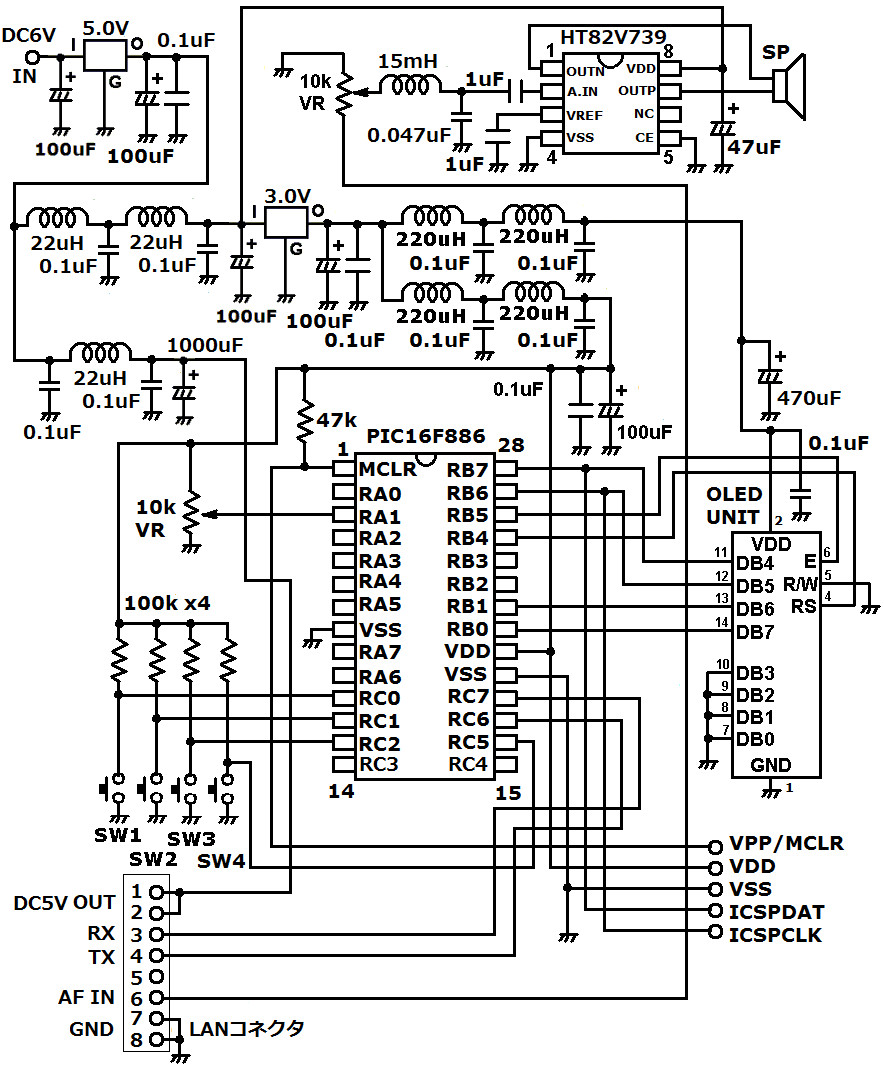 | 操作ユニットには制御マイコン部、表示部、電源部、音声アンプ部、操作部があります。表示には8文字2行のOLED表示モジュールを使います。このモジュールはかなりのノイズを発生するので電源回路にLCフィルターを大量投入しています。音声アンプは過去の製作でよく使っている定番回路です。操作ユニットと受信ユニットはお互いのマイコンでUART通信をしています。今回お互いの距離が5mあるので通信状態を心配しましたが、全く問題はありませんでした。ボーレートは9600bpsです。今回の製作で過去のソフトに一部不具合が見つかりましたので、今回最新版のソフトを公開しています。ACアダプターは操作ユニットに接続します。LANケーブルの中はDC5V電源、GND、音声、UARTが存在します。 | |