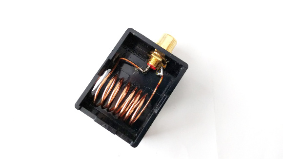 | アンテナチューナーのアンテナ出力はバーアンテナに直接接続することは出来ません。上図のように太目の銅線(絶縁膜あり)を使ってカップリングしています。巻き数は7回程度です。でも巻き数はあまり気にすることはないと思います。 | |
