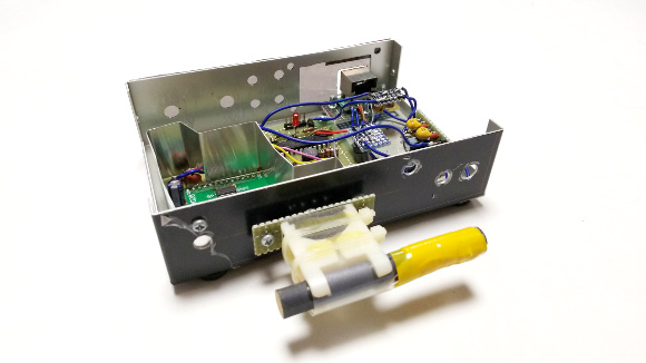 | OLED表示モジュールの背面からノイズを発生していますので、アルミ板でシールドをしています。音声を録音するために背面に出力を配置しています。 | |