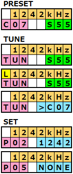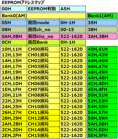 | EEPROMのバンクは2バンクとしました。各バンク15局のプリセットが可能です。バンクの切換えは電源投入時にSW1,SW2のどちらかを押しながら投入することで切換えます。詳しくはソースを見て下さい。電源を切っても前回のモードやプリセット番号を記憶しています。 | |