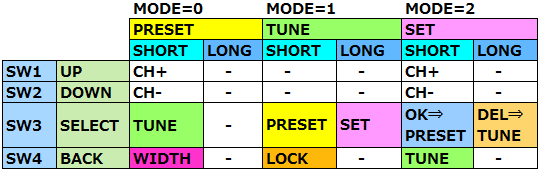 | 4つのボタンを使って操作します。過去の製作から一部操作を入れ換えています。今後短波用の受信機を作る際に操作が統一出来るようにしました。マニュアル選局はボリュームの操作で行いますので、アナログ的でやりやすいと思います。 | |