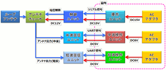 | 既にお馴染みになりますが、室内には操作ユニットのみを残して受信ユニットは屋外に設置します。あくまでも個人的感想ですが、受信ユニットは室内にあるより屋外にある方がラジオの感度は良くなると信じています。では回路図を見てみましょう。 | |