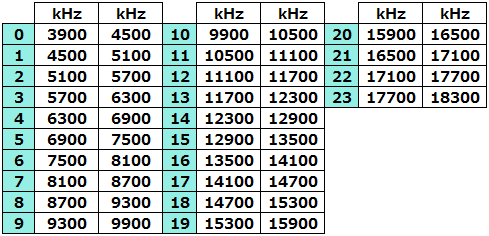 | 4つのボタンを使って操作します。基本操作はAMラジオとほぼ同じです。但し今回は周波数ロックはありません。AMラジオの周波数ロックは受信音声を録音している時になにかの弾みで選局ボリュームを回してしまって録音を失敗することを防ぐためです。短波の場合はリアルタイム受信がメインと思いますので、付けませんでした。まあこのあたりは皆さんの好みで改造などして下さい。短波は受信周波数帯域が広いので、受信周波数バンドを切換えるようにしました。上図の「FREQ+/FREQ-」ボタンです。選局ボリュームの範囲が限られているので、下図のように単純に600kHzごとに区切っているだけです。今回は周波数上限を18300kHzとしました。この辺りも好みで改造してみて下さい。 | |