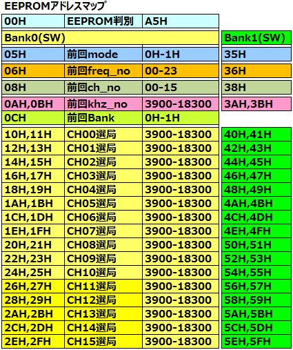 | EEPROMのバンクは2バンクとしました。各バンドに15局のプリセットが可能です。バンクの切換えは電源投入時にSW1,SW2のどちらかを押しながら投入することで切切換えます。詳しくはソースを見て下さい。電源を切っても前回のモードやプリセット番号を記憶しています。 | |