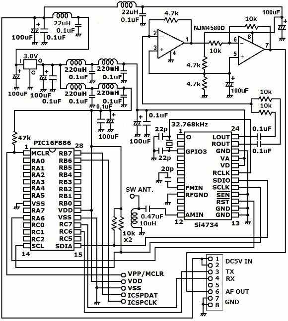 | 構成はAMラジオと同じです。DSPラジオのアンテナ接続部分が異なるのみです。DSPラジオ部には定番のシリコンラボ製Si4734を使用します。私は古い製作から取り出して使用していますので、ずっと同じICを使っていることになります。AMラジオの時と同じ説明になりますが、ラジオの音声は出力はOPアンプでバッファーをかましています。私の場合、受信ユニットと操作ユニット間はケーブル長さで5mほどあります。ラジオのチップに直接ケーブルが接続されないので、ノイズの影響を受けにくくなると思います。受信ユニットと操作ユニットはLANケーブルで接続します。電源部分にはLCフィルターを多用して、電源からのノイズを低減しています。電源の供給は操作ユニットから行います。AMラジオを受信していて判ったのですが、スマホの充電器でスマホに充電している時、かなりのノイズが電源ラインから飛び込んできます。そのようなノイズは防ぐことが出来ませんので、局を受信中は充電を控えることをお勧めします。ただ、全ての充電器がノイズを出している訳ではありませんので、お間違い無きよう。 | |