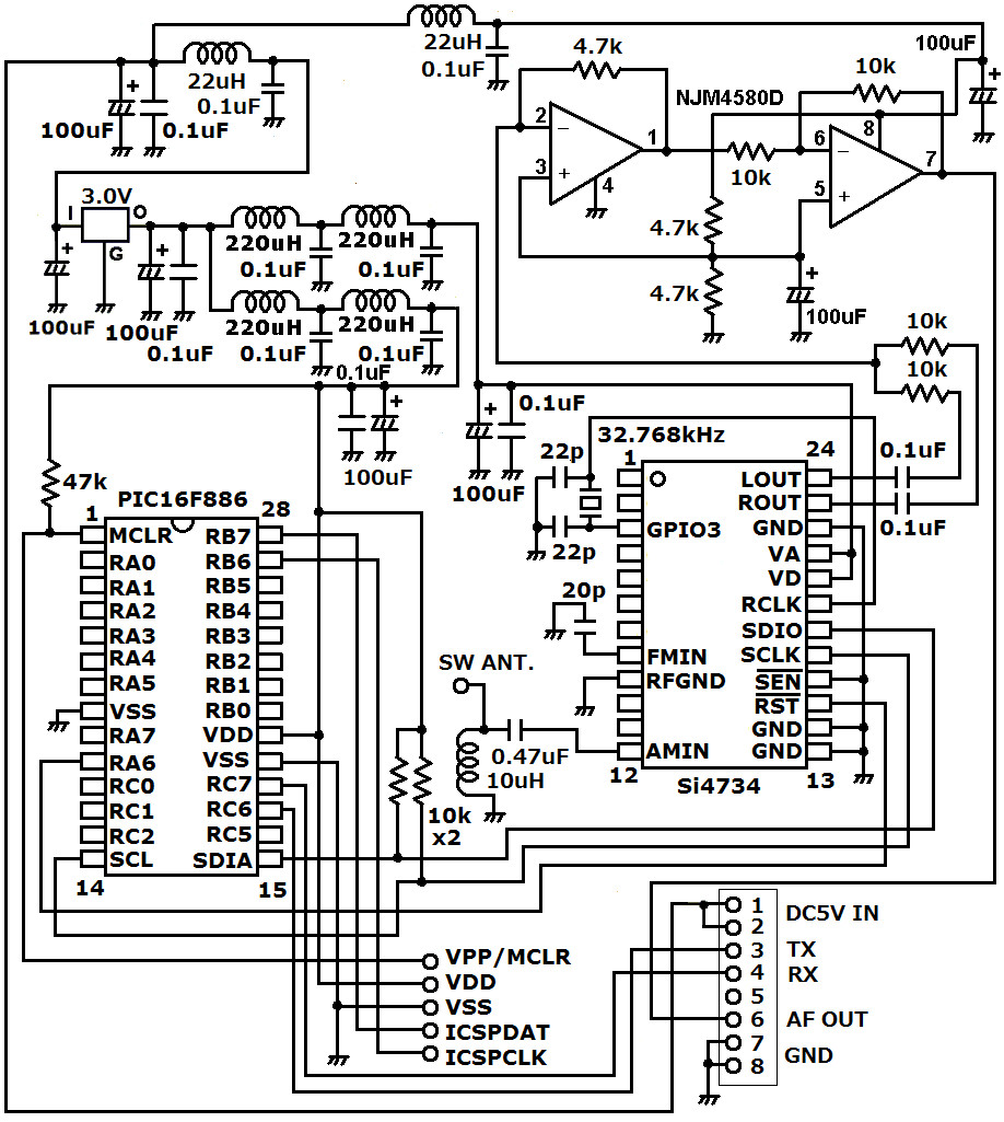 | 操作ユニットの構成はAMラジオの時と全く同じです。PICマイコンのソフトが異なるのみです。一応説明します。表示には8文字2行のOLED表示モジュールを使います。今私が使っているものはかなり前に購入したものですので、3V動作品ですが、今は5V動作のものが多いと思います。その辺りは各自で工夫して製作して下さい。音声アンプは過去の製作でよく使っている定番回路です。操作ユニットと受信ユニットはお互いのマイコンでUART通信をしています。距離が長いのでボーレートは9600bpsにしています。ACアダプター6V出力で必ずトランスタイプのものを使用して下さい。 | |