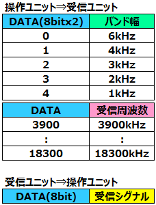 | 通信はAMラジオとは異なります。操作ユニットから受信ユニットは2バイトデータです。周波数データをそのまま送ります。データが0〜4の時はバンド幅を切換えます。バンド幅の初期値は3kHzです。受信ユニットからは受信シグナルの強度を送ります。これはAMラジオと同じです。定期的に送ってきますから、リアルタイムの値ではありませんのでご注意下さい。アンテナチューナーがうまく同調しているかは受信音声を聞いていれば判ると思います。 | |