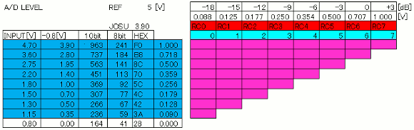 | 入力電圧とLED表示の関係は上図のようにしました。入力電圧にはオフセットがあるので、それを除いた部分以上を対数で表示出来るようにエクセルで計算しました。この辺りは皆さん各自で工夫してみて下さい。私的にはこの表示の計算には満足しています。 | |