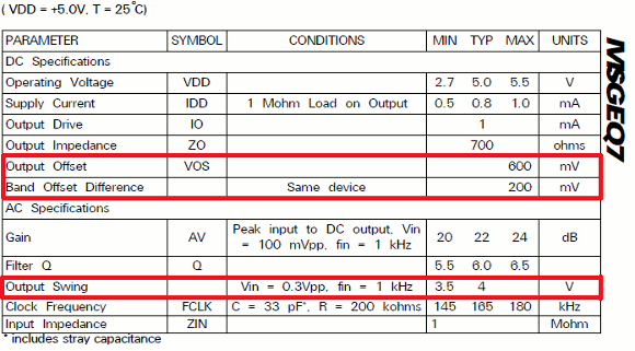 | スペアナ用ICのMSGEQ7は周辺回路を非常にコンパクトに出来るICですので、とても便利ですが、少し気を付けるところがあります。仕様書を読みこなすと上図に示した部分が目に入ります。出力オフセットが0.6Vもあることです。そしてオフセットのばらつきが0.2Vもあることです。最初この部分に気が付かず苦労しました。ということで、0.8V以下の信号レベルは無視するようにしました。入力電圧が0.3Vppの時に出力電圧は4V以上出ますので、最終的には入力のボリュームで適当な表示なるように調整して下さい。 | |