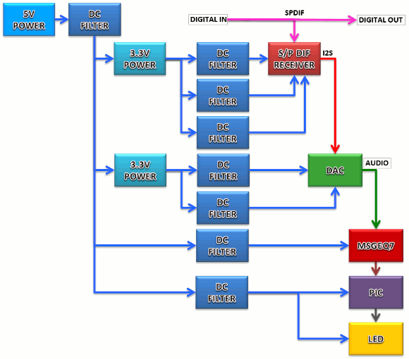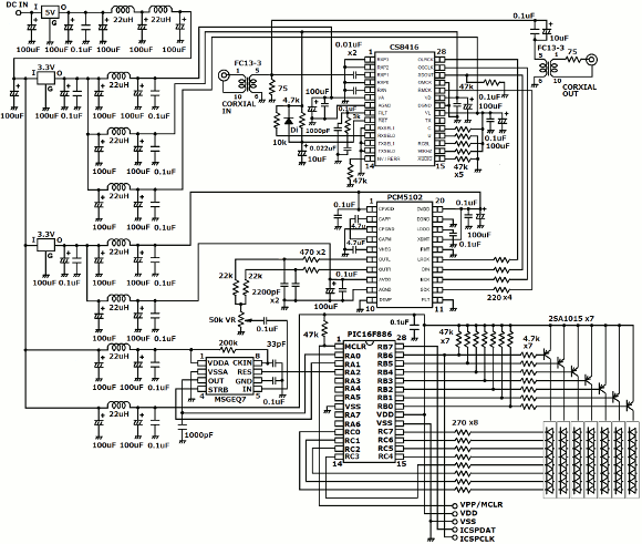 | ブロック図は電源回路が多くを占めています。デジタル系とアナログ系が混在する回路には電源回路が重要ですので、このようにしています。デジタル信号はS/P DIF・レシーバーで受けてI2S信号に変換します。これをDACで受けてアナログのオーディオ信号にします。レシーバーとDACはハイレゾ対応にしています。オーディオ信号をスペアナ用ICのMSGEQ7で受けて周波数ごとの電圧信号に変換します。これをPIUCマイコンで受けてLED表示をします。 | |
