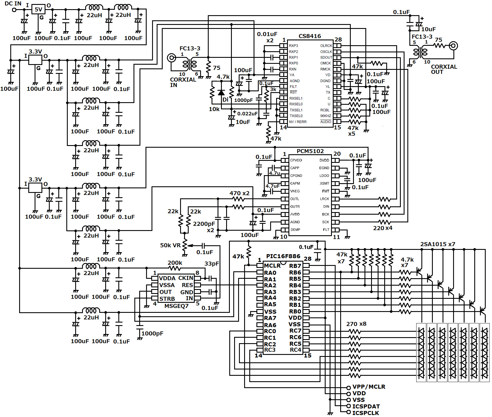 | 正直なところ電源回路はここまで凝らなくてもよかったのかもしれませんね。オーディオ信号はLRをミックスしてボリュームを介してスペアナ用ICに入力しています。このボリュームは信号レベルの調整に役にたちます。各周波数の信号レベルは8個のLEDで表示します。スペアナ用ICにはMSGGEQ7を使用します。7バンド対応で周波数は[63Hz]、[160Hz]、[400Hz]、[1kHz]、[2.5kHz]、[6.25kHz]、[16kHz]です。ほぼ仕様書通りの回路を構成していますが、おまじないとしてIC出力に1000pFを追加しました。これがないと少し信号レベルが安定しないようです。私として納得するまで調整したつもりです。デジタル信号は出力を設けましたので、別のデジタル機器に接続が可能です。 | |