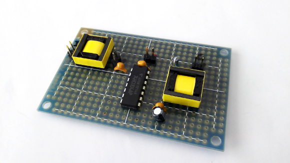 | デジタル入出力用にFC13-3のデジタルオーディオ用パルストランスを使用します。私の知る限りでは共立電子さんから購入するのが簡単と思います。上の写真にはデジタルICが載っていますが、最終的には使用しませんでした。回路図が最終です。 | |