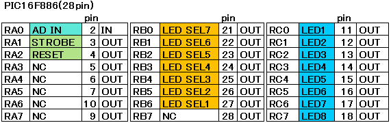 | PICマイコンのポート割付は上図の通りです。PICのソースファイルは下記からダウンロードして使って下さい。 PICマイコンのソース一式はこちらです。 |