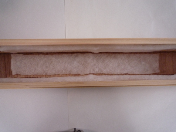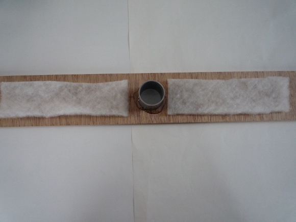 | 今回はエンクロージャーとなる前に吸音材を内部に貼り付けます。吸音材にはクッション用の素材(キルトシン)を使いました。私は手芸屋で購入しています。 | |