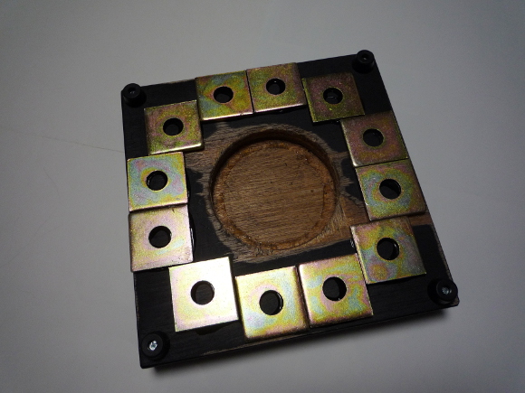 | ホームセンターを物色していたところ結構な厚みのある座金を見つけました。これをベースに複数貼り付けることで重さを増すことにします。 | |