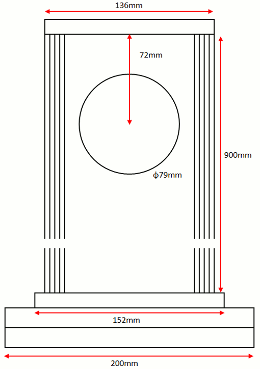 | 前回の製作でScanspeak製5cmフルレンジを作り直しましたが、結構低音がしっかりしたので、今回も同じ方式で設計しました。全高900mm超えで、背面バスレフです。バスレフポートはセンターに配置しています。 | |