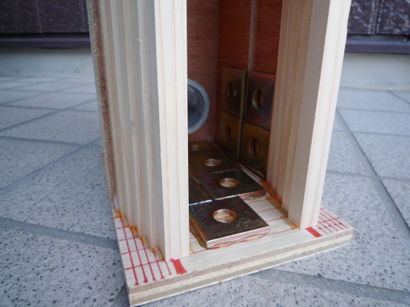 | エンクロージャーの重量を増す為に下部の内部に金属板を貼り付けます。底面に7枚、左右側面に4枚づつ、片側に合計15枚の金属板を万能ボンドでしっかり貼り付けます。 | |