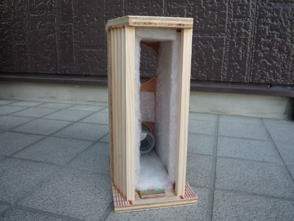 | スピーカー端子を取り付ける位置には吸音材を逃がしておきます。背面板を取り付けてエンクロージャーの完成となります。ここから仕上げに入ります。 | |
