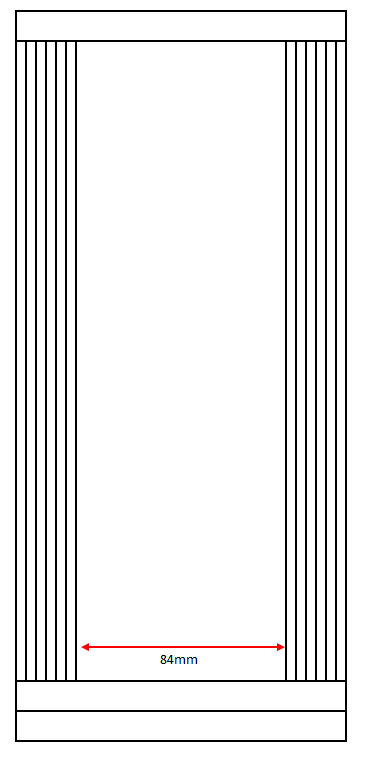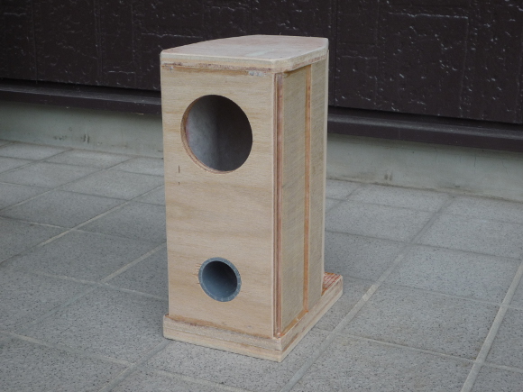 | DigiFi No.19と同じく普通のバスレフです。今回の違いは角材を使う位置です。前面付近には長手の合板のみを使って、背面付近に集中して角材を使いました。そうすることで前から見たとき少しスリムになり、背面もよりスリムになりました。バスレフダクトの周波数は約108Hzになりました。ちょうどよい具合になると思います。高さはDigiFi