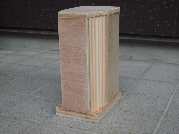 | 前面板に天面板と底面板を取り付けてから、角材と合板を隙間なく、板に書いた位置の通りに、接着して行きます。接着ごとに重石をおいてじっくり組み上げて行きます。 | |