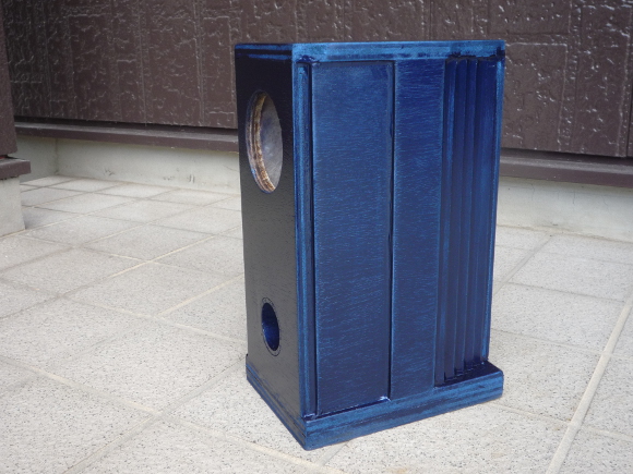 | 今回は前面方向に角材を使用しませんでしたので、紙粘土などで曲面にすることは行いませんでした。段差をそのまま活かします。そのおかげかどうかわかりませんが、前面からの見栄えはすっきりしています。#120、#240の紙やすりで全体が滑らかになるように仕上げます。今回も車用の塗装でちょっと贅沢をします。今回は「青色」です。 | |
