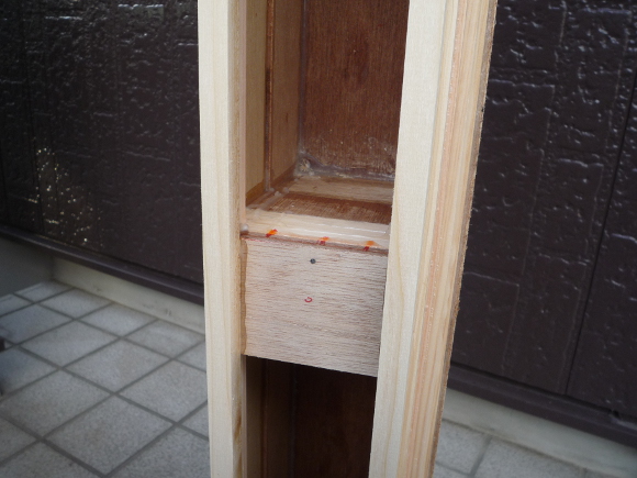 | 前面板に天面板と底面板を取り付けてから、角材と合板を隙間なく、板に書いた位置の通りに、接着して行きます。隙間の出来ないように接着ごとにおもしをして時間をかけてゆっくり行います。 | |