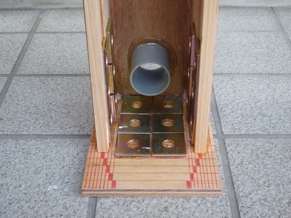 | 重さが適度にあり、リーズナブルな金属板を下部の内部に貼り付けてエンクロージャーの重心を低くします。底面に6枚、左右側面に6枚づつ、片側で計18枚を万能ボンドでしっかり貼り付けます。 | |