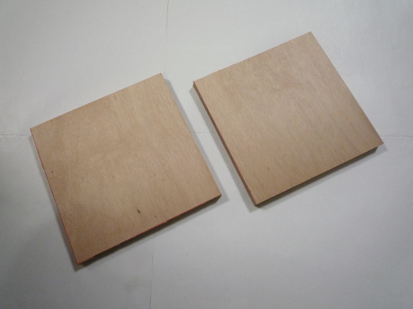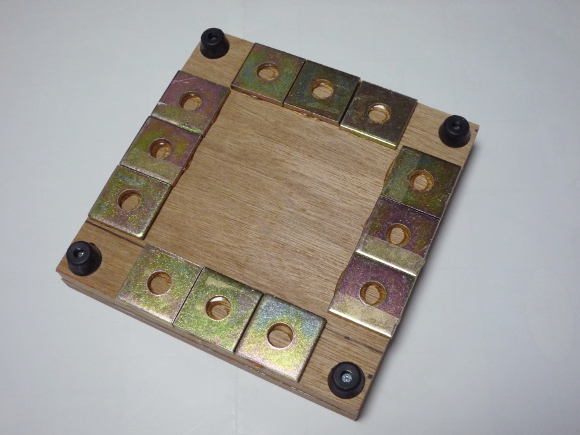 | 15mm厚の合板を使います。2枚を木工用接着剤でしっかりと貼り合わせします。裏面には金属板を万能ボンドで貼り付けして重さを稼ぎます。12枚貼り付けることが出来ました。ゴム足は高さのあるもを使います。 | |