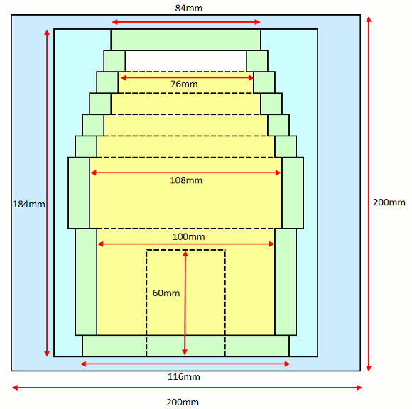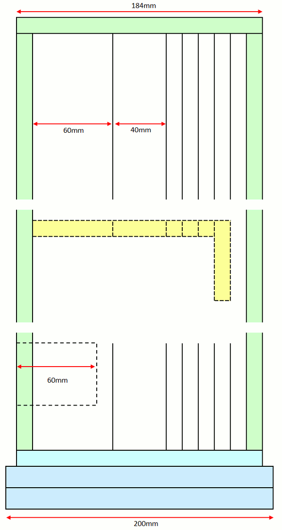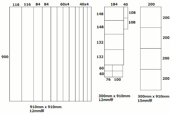 | 今回は製作コストを安くする為に、今までの製作で余った合板を使って仕上げました。全てハンドでノコギリを使ったので、大変疲れました。何日も掛かって合板を切り出しました。板取りの寸法を記します。いつもと同じ12mmの合板と12mm角ヒノキで組み上げます。 | |