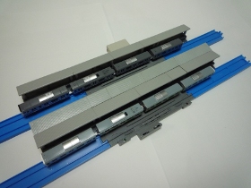| 例えばこのように配置すると品川駅の山手線と京浜東北線を再現することが出来ます。どちらの車両もストップ-スタート制御出来ますので発車音とからめるととても楽しい制御が可能となります。 | |