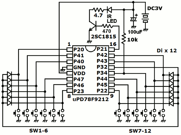 | 今回のリモコンでは12個のボタンを操作します。回路も変更して新作としました。 | |