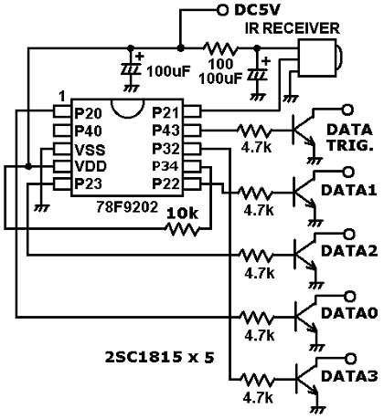 | このように従来の6本の制御線を4bitデータと1bitトリガに分けて制御マイコンを駆動します。こうすることで最大16種類の制御が可能になります。(トータル5本なので1本は余り) そのうちの12種類を割り当てることで制御を行います。 まずは赤外線受信マイコンについて。 |