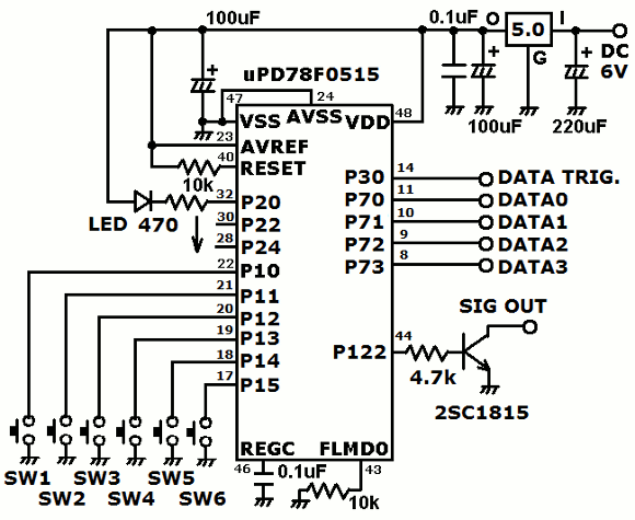 | 従来の制御は上図のように赤外線受信マイコンから6操作分の制御をそのまま制御マイコンに入力してコマンドデータを発信していました。今回からその制御線が不足するので少し考え方を変えて制御マイコンを駆動します。 | |