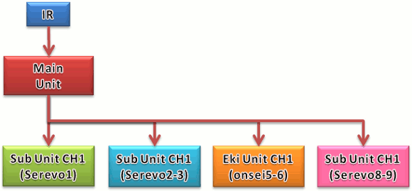 | リモコンの信号を受けて制御する側にも拡張工事が必要となります。従来は6個の操作しか出来ませんでしたので、回路も制御もそれなりでした。今回から12個の操作の制御をしなくてはいけません。できるだけハードの変更は最小限に留めることで対応しました。 | |