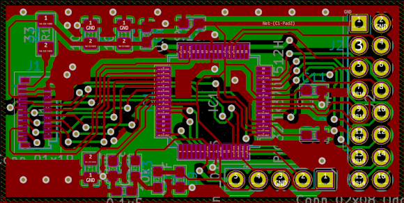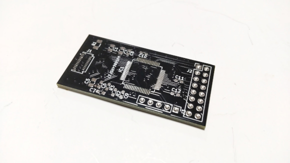 | 基板の右側の16ピンヘッダーに合わせて基板サイズを決めましたので、かなり小さく出来ました。今回の液晶モジュールはフレキの寸法が短いので、ピンヘッダーは基板裏側に出るようにはんだ付けします。 | |
