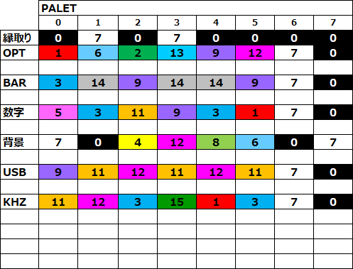 | 今回使う色は7色です。画像データはパレット0の色で作成して、パレット色を変えることで画面の色デザインを行っています。こうすることで元データの容量を減らすことが出来ます。私の好みで色を決めていますので、参考程度に留めて下さい。 | |