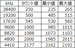 | 大きくDACのサンプリング周波数は上図のようになると思います。カウント値より判断してサンプリング周波数を決定しています。カウント値のばらつきの範囲はかなり大きく取っています。あまり狭くすると周波数を認識しないことがありましたので。 | |