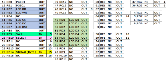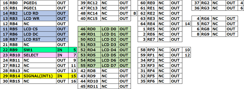 | 液晶モジュール駆動以外には最小限のポートしか使用しません。最初にサンプリング周波数を測定する原理を説明しておきます。サンプリング周波数はDACへ入力されるLRCLKの周波数を測定すれば良いのです。そこで周波数をどう測るかですが、私はLRCLKの信号をINT1(RB14)に接続して、この端子に入力される信号の立上りで割り込みを掛けて、その立上り毎にTMR2のカウント値を読み出して、その数値を調べることで周波数を決めています。最初はカウント値から周波数を計算しようと試みましたが、なぜか上手くいかなかったので、サンプリング周波数に特化した周波数判定としました。この辺りはソースリストを見て下さい。SW1(RB9)はプッシュSWに接続して液晶表示のカラーを変えるスイッチとしました。但し、その状態を外部に記憶はしていないので、電源を入れる毎に初期の色に戻ります。SELECT(RB10)は前面の切り換えスイッチを読んで光デジタルからの入力かUSBからの入力かの表示を切り換えます。この切り換えスイッチはリレーを切り換えるのとは全く別回路にしないといけないので、2回路のスイッチに交換しています。 | |