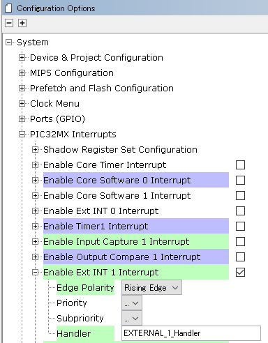| Systemの設定を開いて、Ext INT1にチェックを入れます。Edgeは立上りを選択します。割り込みの設定はこれだけです。とても簡単です。 | |