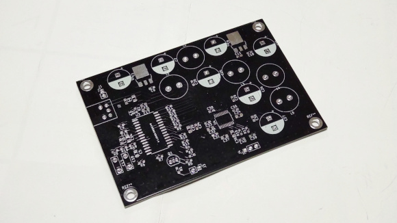 | ちょっとインダクタの大きさを勘違いしていたので、基板サイズをもう少し小さく出来たかもです。金色のオーディオ用電解コンデンサが眩しい。 | |